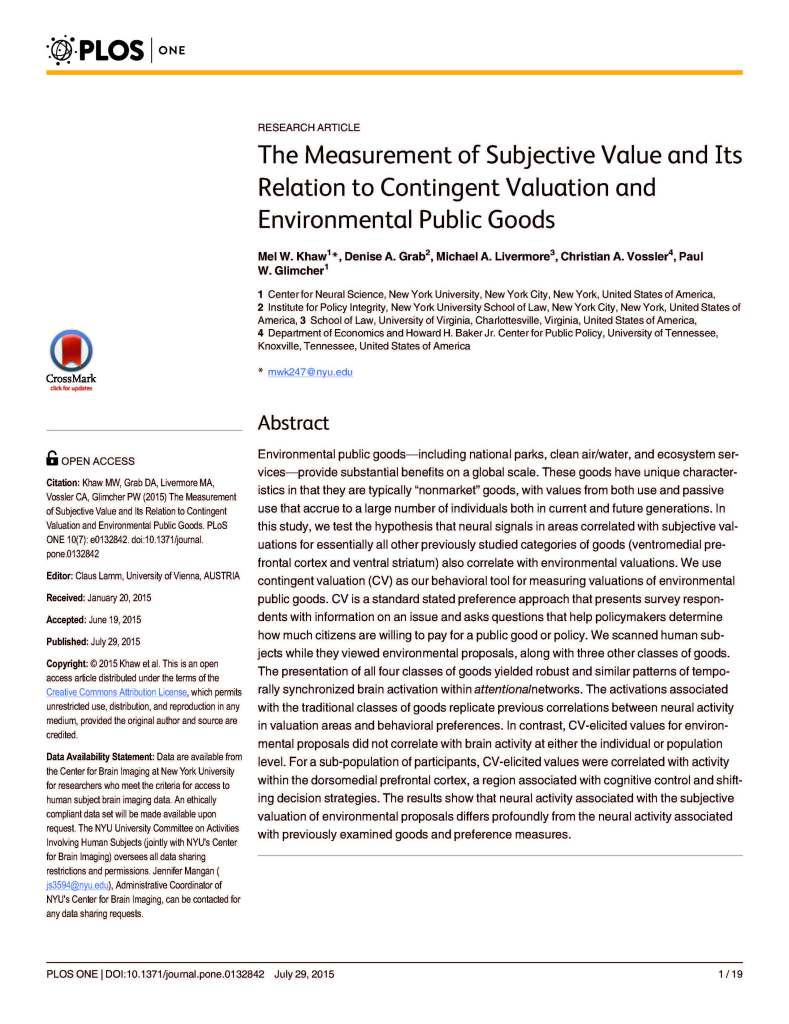In this study, we test the hypothesis that neural signals in areas correlated with subjective valuations for essentially all other previously studied categories of goods (ventromedial prefrontal cortex and ventral striatum) also correlate with environmental valuations. We use contingent valuation (CV) as our behavioral tool for measuring valuations of environmental public goods. CV is a standard stated preference approach that presents survey respondents with information on an issue and asks questions that help policymakers determine how much citizens are willing to pay for a public good or policy. We scanned human subjects while they viewed environmental proposals, along with three other classes of goods. The presentation of all four classes of goods yielded robust and similar patterns of temporally synchronized brain activation within attentional networks. The activations associated with the traditional classes of goods replicate previous correlations between neural activity in valuation areas and behavioral preferences. In contrast, CV-elicited values for environmental proposals did not correlate with brain activity at either the individual or population level. For a sub-population of participants, CV-elicited values were correlated with activity within the dorsomedial prefrontal cortex, a region associated with cognitive control and shifting decision strategies. The results show that neural activity associated with the subjective valuation of environmental proposals differs profoundly from the neural activity associated with previously examined goods and preference measures.