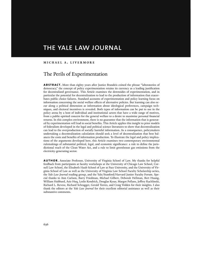 More than eighty years after Justice Brandeis coined the phrase “laboratories of democracy,” the concept of policy experimentation retains its currency as a leading justification for decentralized governance. This Article examines the downsides of experimentation, and in particular the potential for decentralization to lead to the production of information that exacerbates public choice failures.