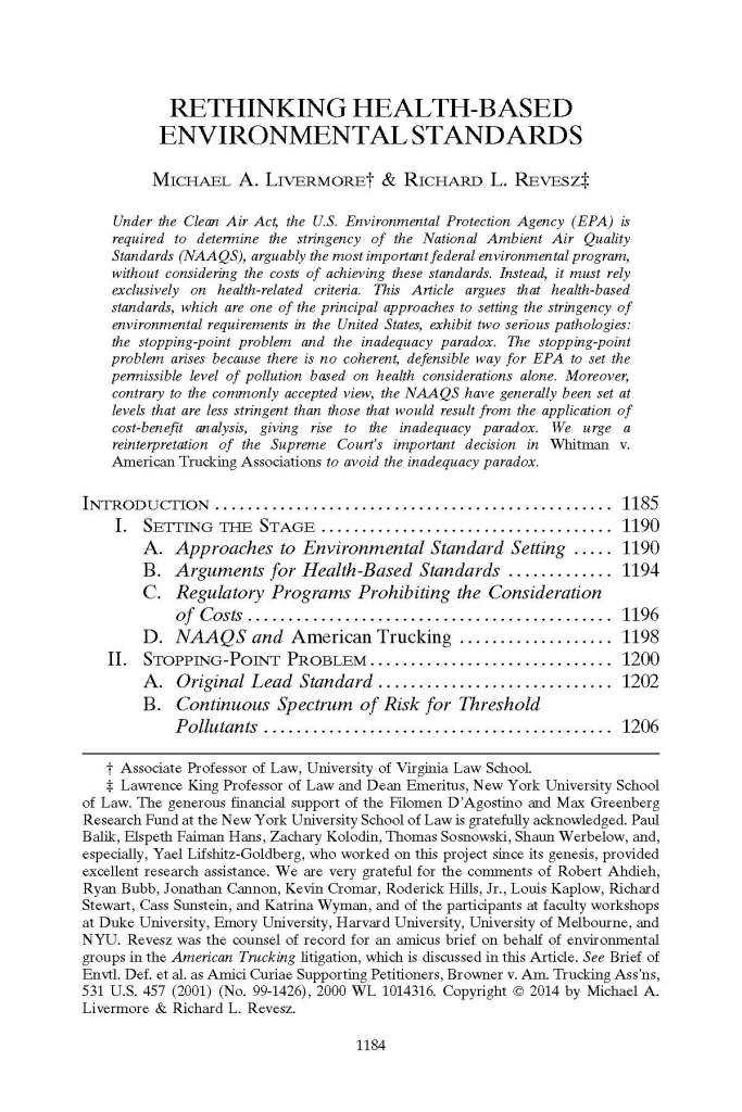The stopping-point problem arises because there is no coherent, defensible way for EPA to set the permissible level of pollution based on health considerations alone. Moreover, contrary to the commonly accepted view, the NAAQS have generally been set at levels that are less stringent than those that would result from the application of cost-benefit analysis, giving rise to the inadequacy paradox. We urge a reinterpretation of the Supreme Court’s important decision in Whitman v. American Trucking Associations to avoid the inadequacy paradox.